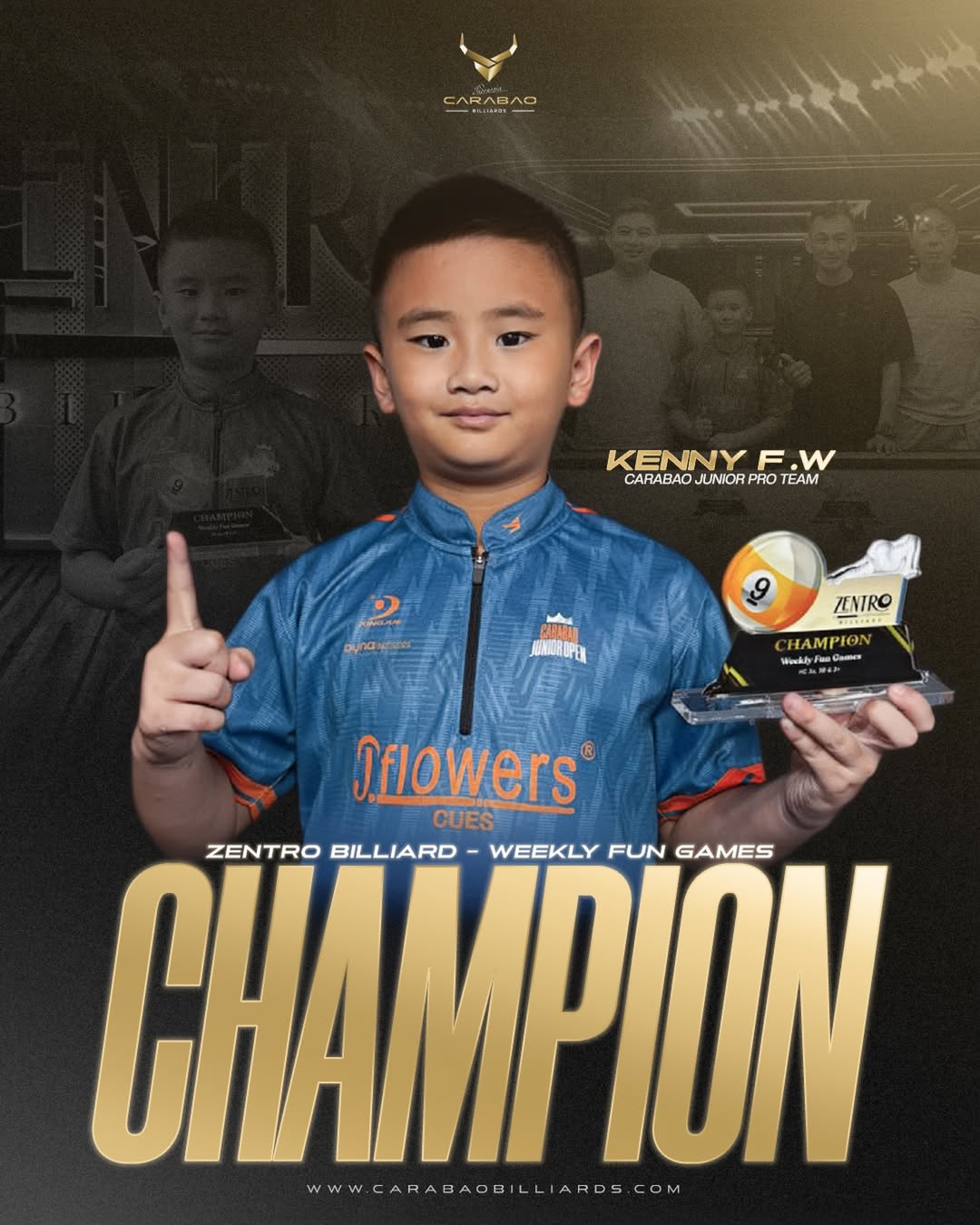 Pemain muda berbakat Carabao Junior Pro Team, Kenny F.W, kembali mencatatkan prestasi membanggakan dengan meraih gelar Champion pada ajang Zentro Billiard. Kemenangan ini menjadi bukti nyata dari proses panjang, disiplin, dan pembinaan yang konsisten di bawah Carabao Billiards Indonesia.